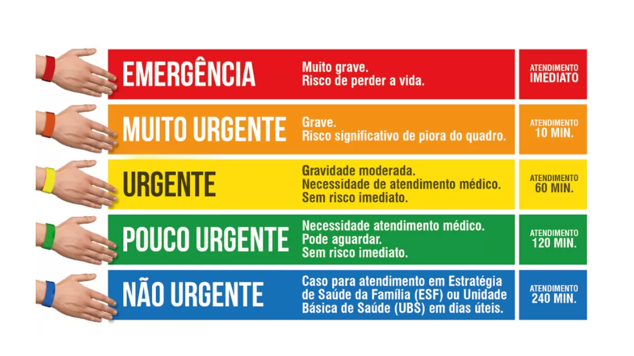 Vermelho: significa emergência, ou seja, o paciente deve ser atendido imediatamente, pois há risco iminente de morte. Exemplos incluem parada cardiorrespiratória, perda de consciência súbita ou hemorragias graves.